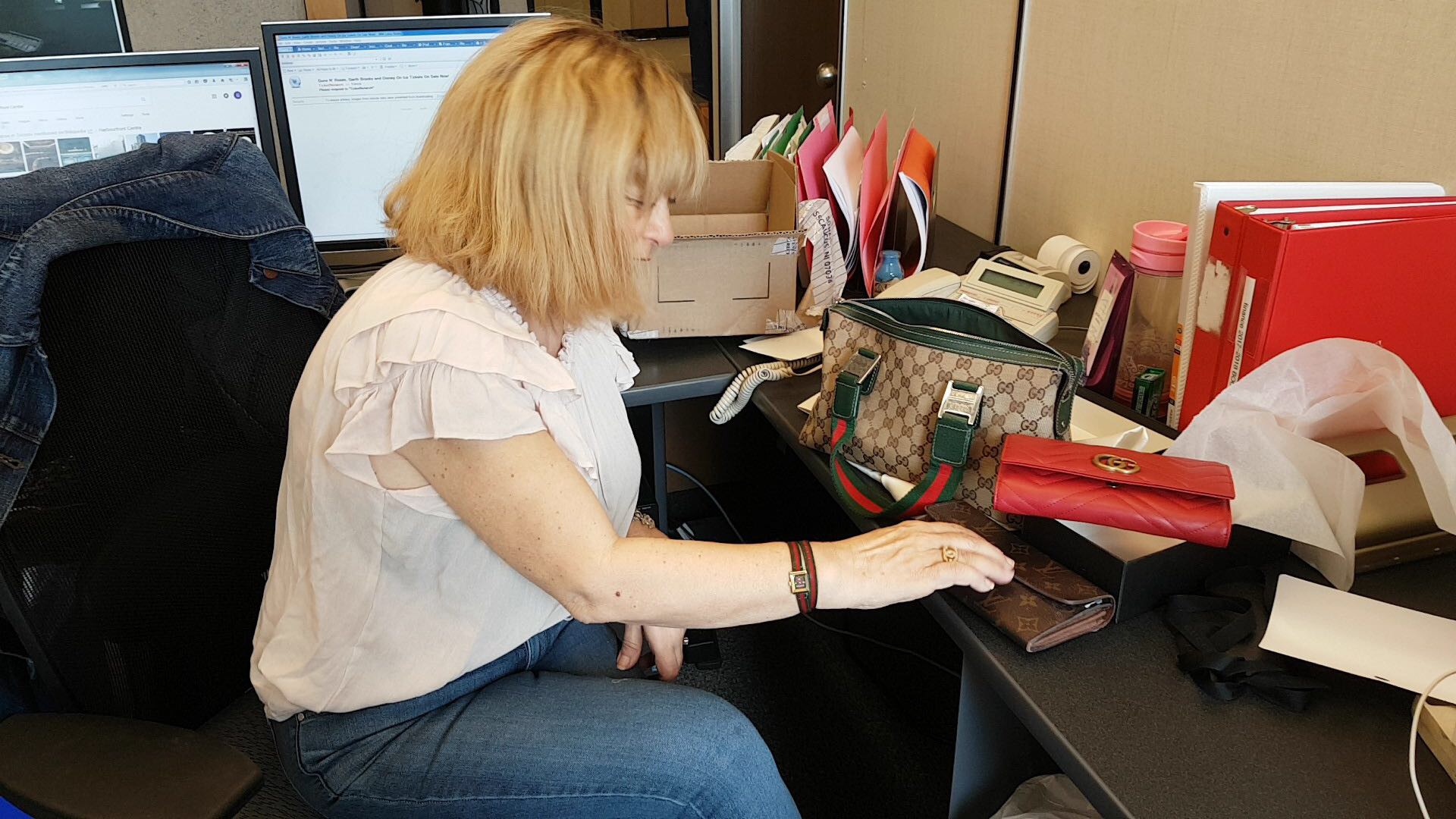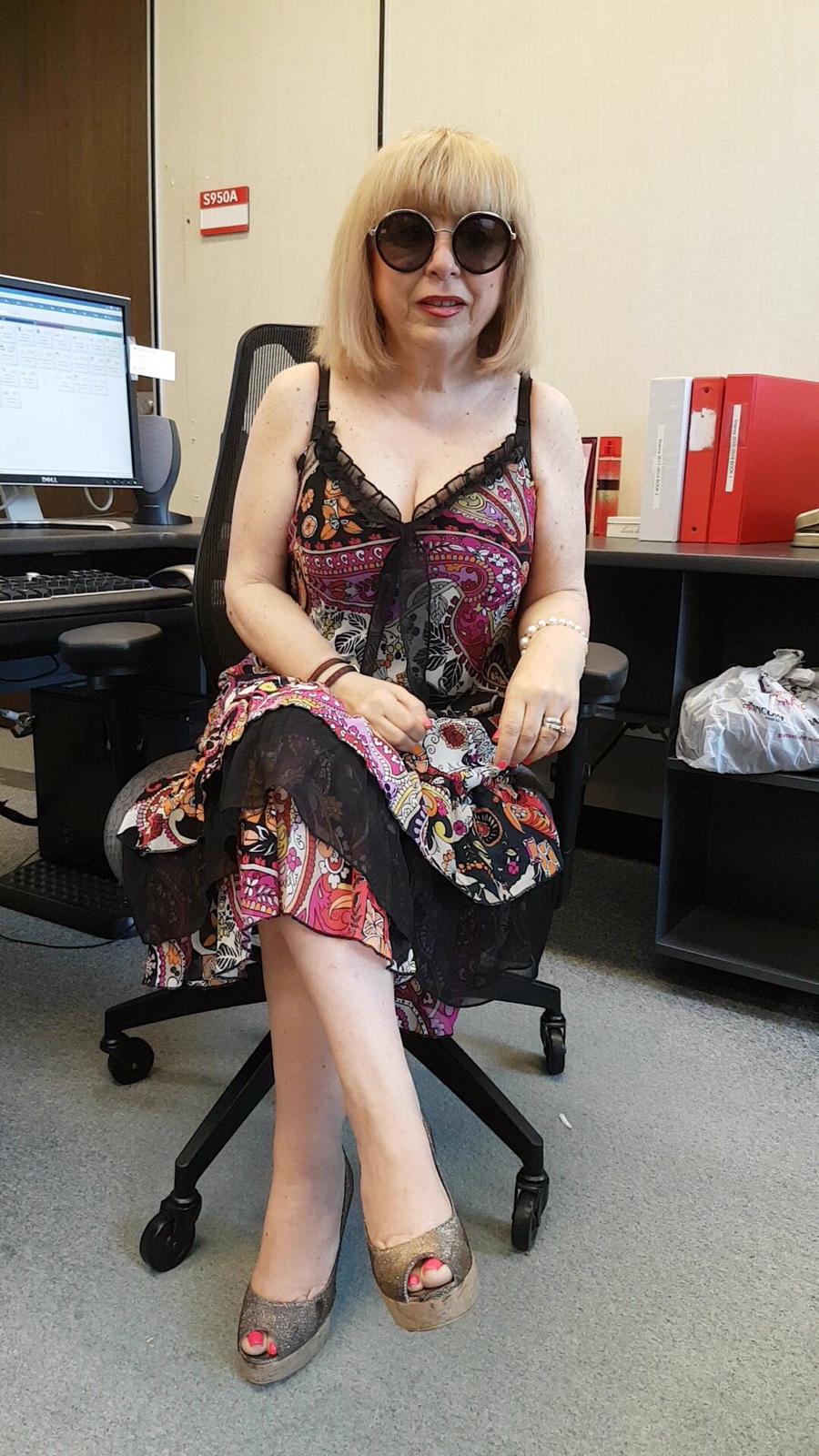 Look at her rocking that printed dress and the heels at work. Do you wear sunglasses at work? Well you should. Look at her pile of high-end goods on her work desk. I can’t. Wow.